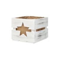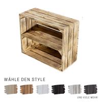 Kisten mit Holzbohlen: TV Lowboard aus 3 geflammten Kisten mit shabby weißer Patina und mit 2 schwarzen Bohlenbrettern auf Rollen 150x53x30
